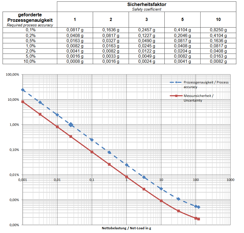 Je kleiner die Einwaage, desto größer wird die relative Messunsicherheit. Für den Prozessverantwortlichen einer Waage ist es wichtig, die auftretenden Abweichungen von minimalen Lasten zu bestimmen. Die Bestimmung der Mindesteinwaage deklariert so anschaulich die verschiedenen Anforderungen an die Wägegenauigkeit bezogen auf die Einwaage.