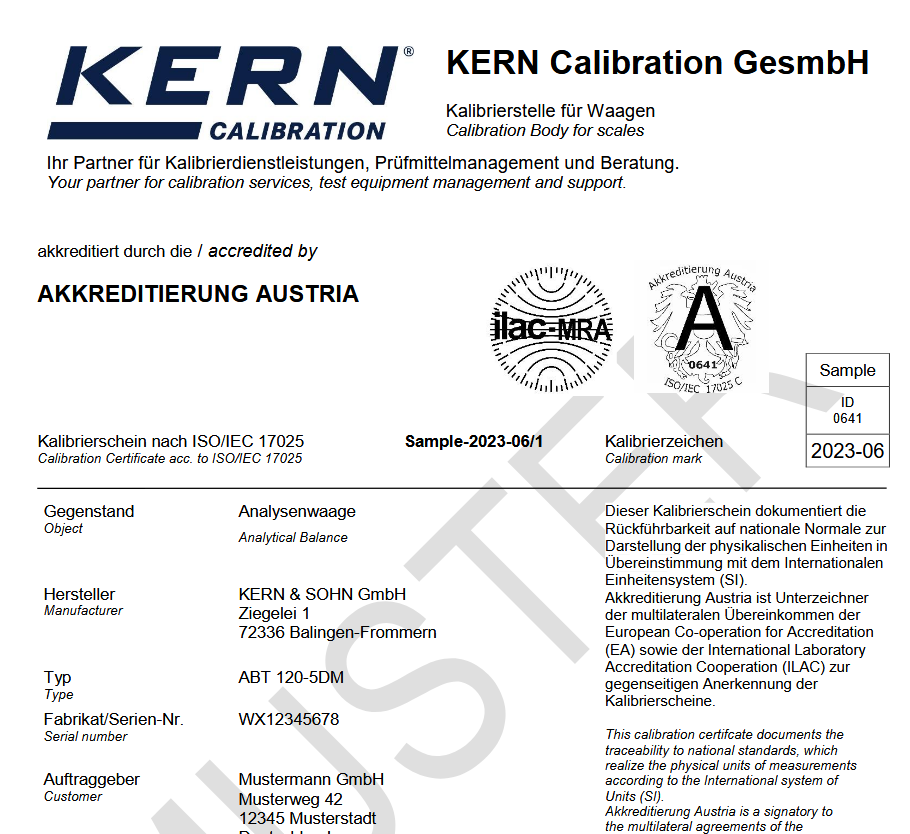 Das Kalibrierlaboratorium der KERN Calibration GesmbH (ID: 0641) ist akkreditiert durch die Akkreditierung Austria. Der Kalibrierschein mit Akkreditierungssymbol wird international anerkannt und ist in vielen Sprachen erhältlich.