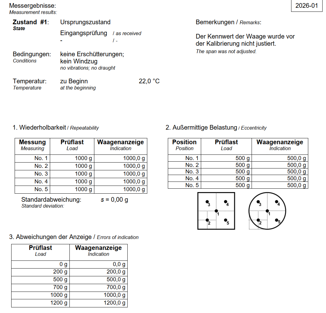 Sollten aufgrund einer Justage oder Reparatur mehrere Kalibrierungen ("as found" / "as left") an der Waage durchgeführt worden sein, so enthält der Kalibrierschein für jeden dieser Zustände einen separaten Abschnitt mit den dazugehörigen Messwerten und -ergebnissen.
