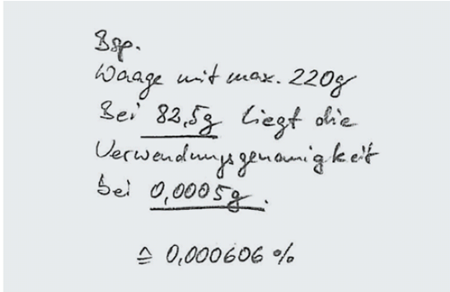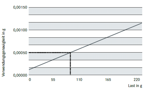 Unter Annahme der gleichen Umgebungsbedingungen (z.B. Windzug, Erschütterungen, …) wie sie zum Zeitpunkt der Kalibrierung am Aufstellort der Waage vorherrschen und geschätzten Raumtemperaturschwankungen von X Kelvin (°C) bei einem der Waage zugeordneten Temperaturkoeffizienten (X•10-6 / K) ergibt sich eine bestimmte Verwendungsgenauigkeit. Die Ermittlung dieser Verwendungsgenauigkeit geschieht gemäß EURAMET cg-18.